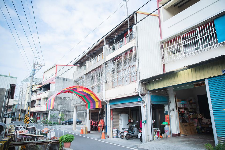 覺得很有台灣味,鐵窗的窗花,木頭門窗,鐵體皮屋頂,以及水塔.再配上彩色的棚子